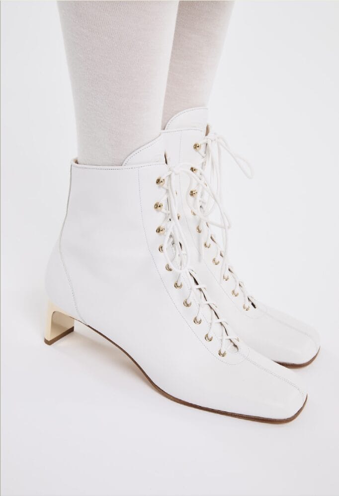 La Patineuse diinspirasikan daripada kasut ice skating, dengan tumit emas halus yang terus tarik perhatian. Rekaan hujung petak dan tali berjalin beri rasa retro moden. Dipakai dengan dress atau seluar longgar, kedua-duanya tetap nampak on point.