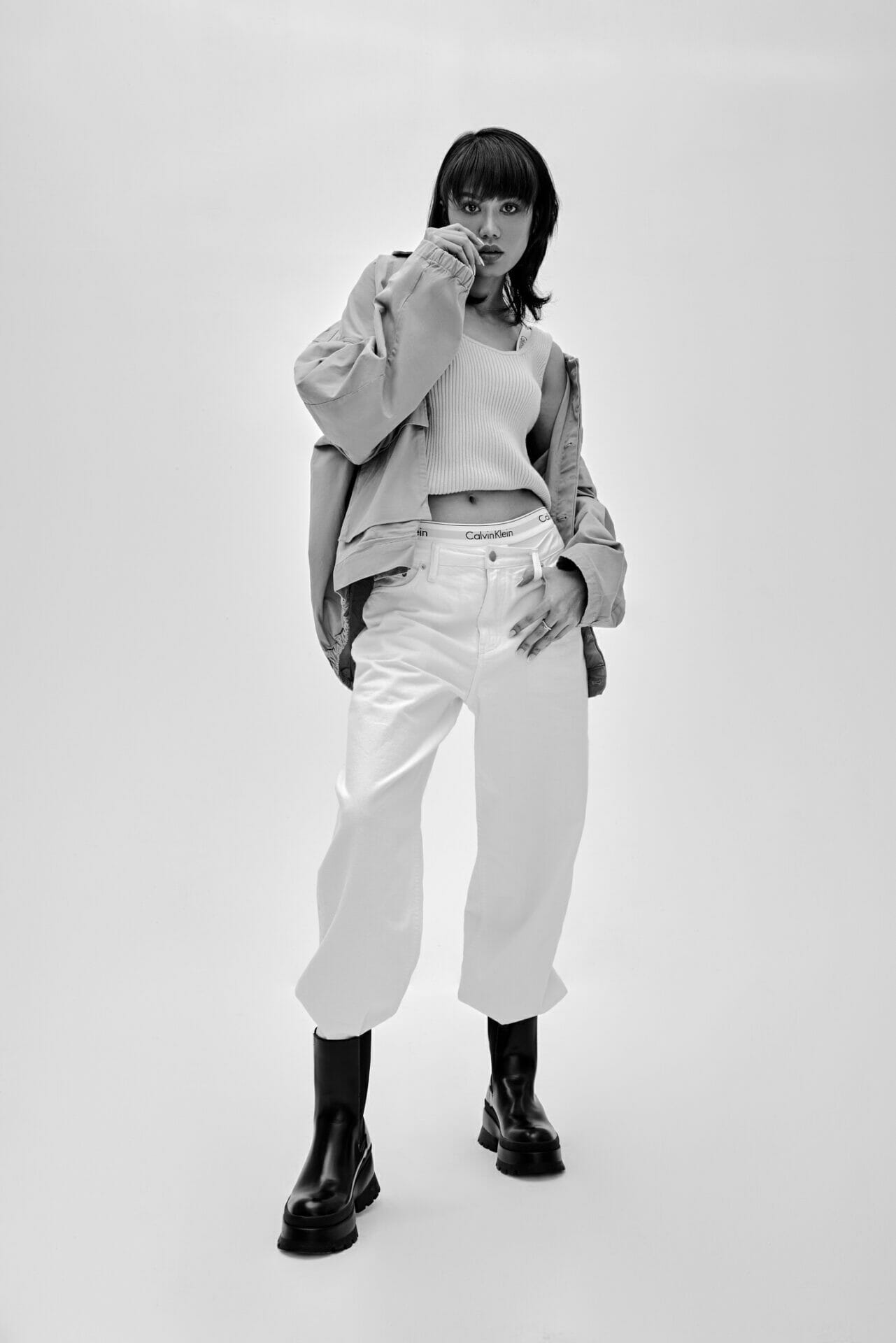 Mimi Lana, figuranya kurus dan tinggi lampai, memang cantik menggayakan apa sahaja. Denim potongan 90-an Calvin Klein nampak terletak saat dia menyarungnya, tambah cool dengan padanan baju crop-top dan jaket puffer. Untuk gaya kedua, Mimi masih dalam padanan ton serupa, warna beige dan putih, baik pada jaket, seluar jean dan outerwear.