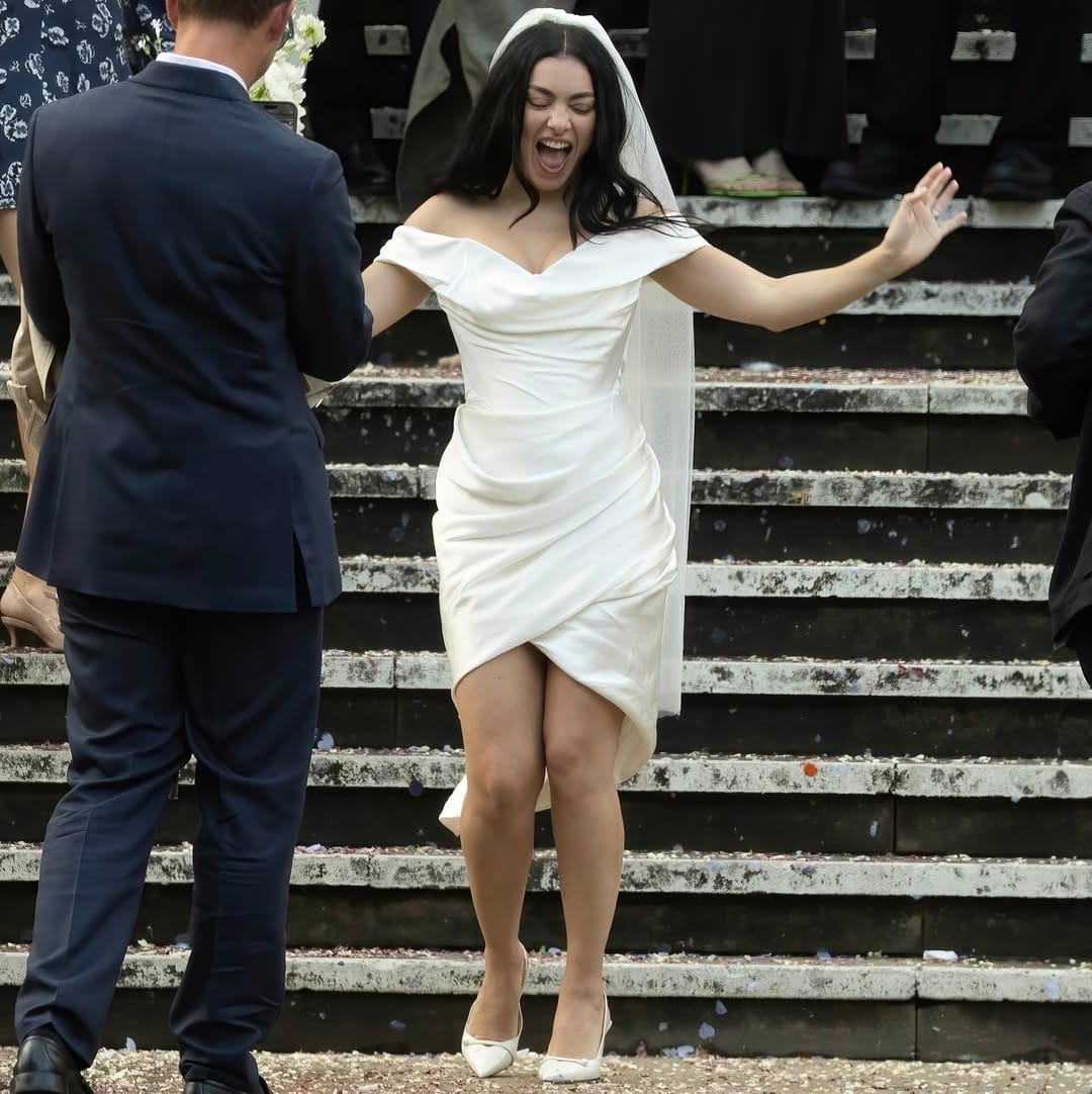 Pada hari istimewanya, Charlie tampil memukau dalam busana putih rekaan Vivienne Westwood yang mempesona, menampilkan potongan bahu-terdedah yang anggun. Gaun tersebut dilengkapi dengan korset yang terletak kemas pada bahagian pinggang, menyerlahkan bentuk tubuhnya dengan penuh keanggunan.