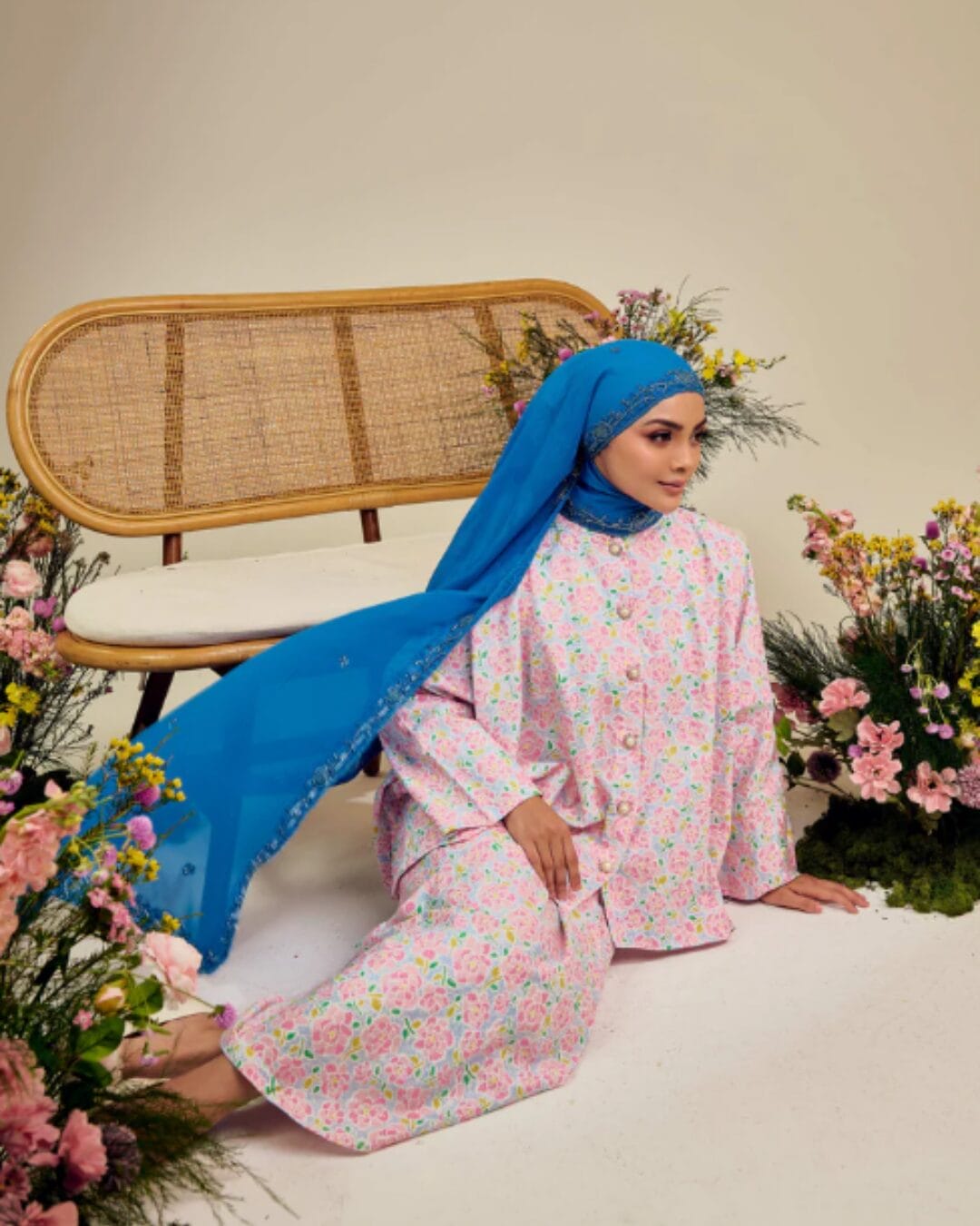 Untuk melengkapkan penampilan, Farah memilih selendang Saharā Vol. II Teal Blue dari Sahara, jenama tudung yang terkenal dengan fabrik lembut dan alunan yang anggun, sarat manik menambah elemen sofistikasi pada keseluruhan gaya.