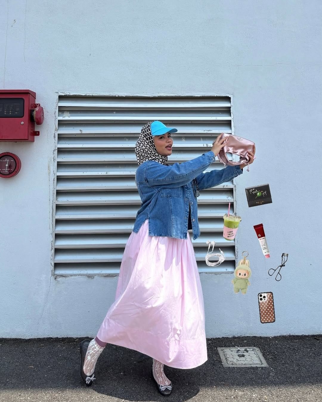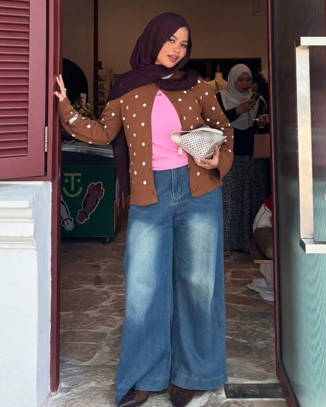 Kardigan berwarna-warni, seluar jeans longgar, dan beg sandang bahu yang comel.