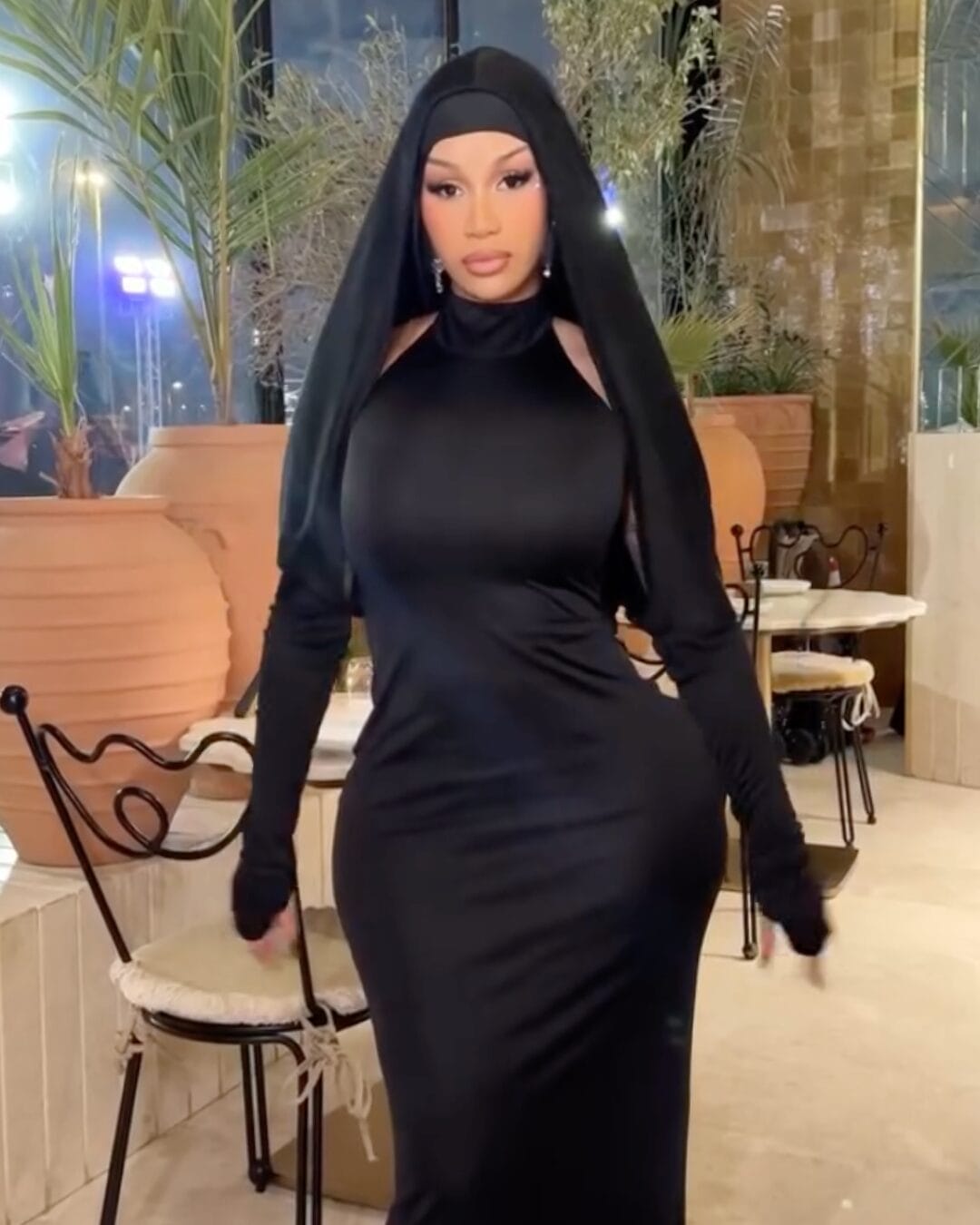 Cardi B semasa di Solitaire Mall Riyadh, menyarung bodycon hitam dengan potongan halter, hood dengan sarung tangan yang dicantumkan yang memancarkan aura yang cukup mewah.