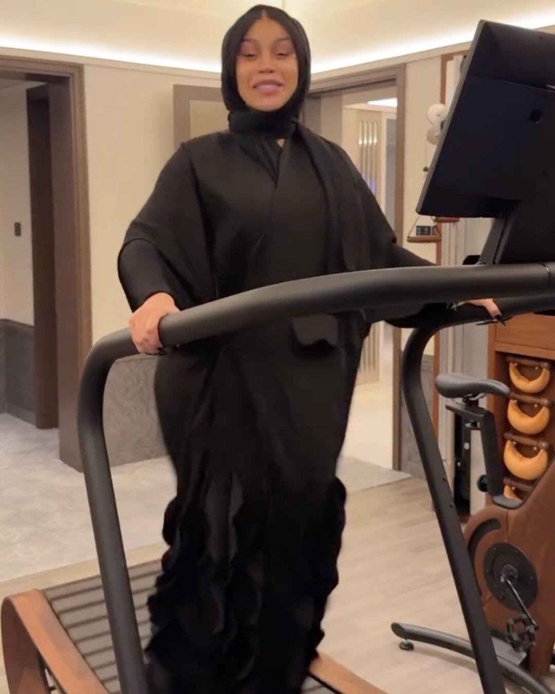 Cardi B di Instagramnya, menunjukkan dia sedang bersenam sambil memakai abaya bersama selendang di atas kepalanya.