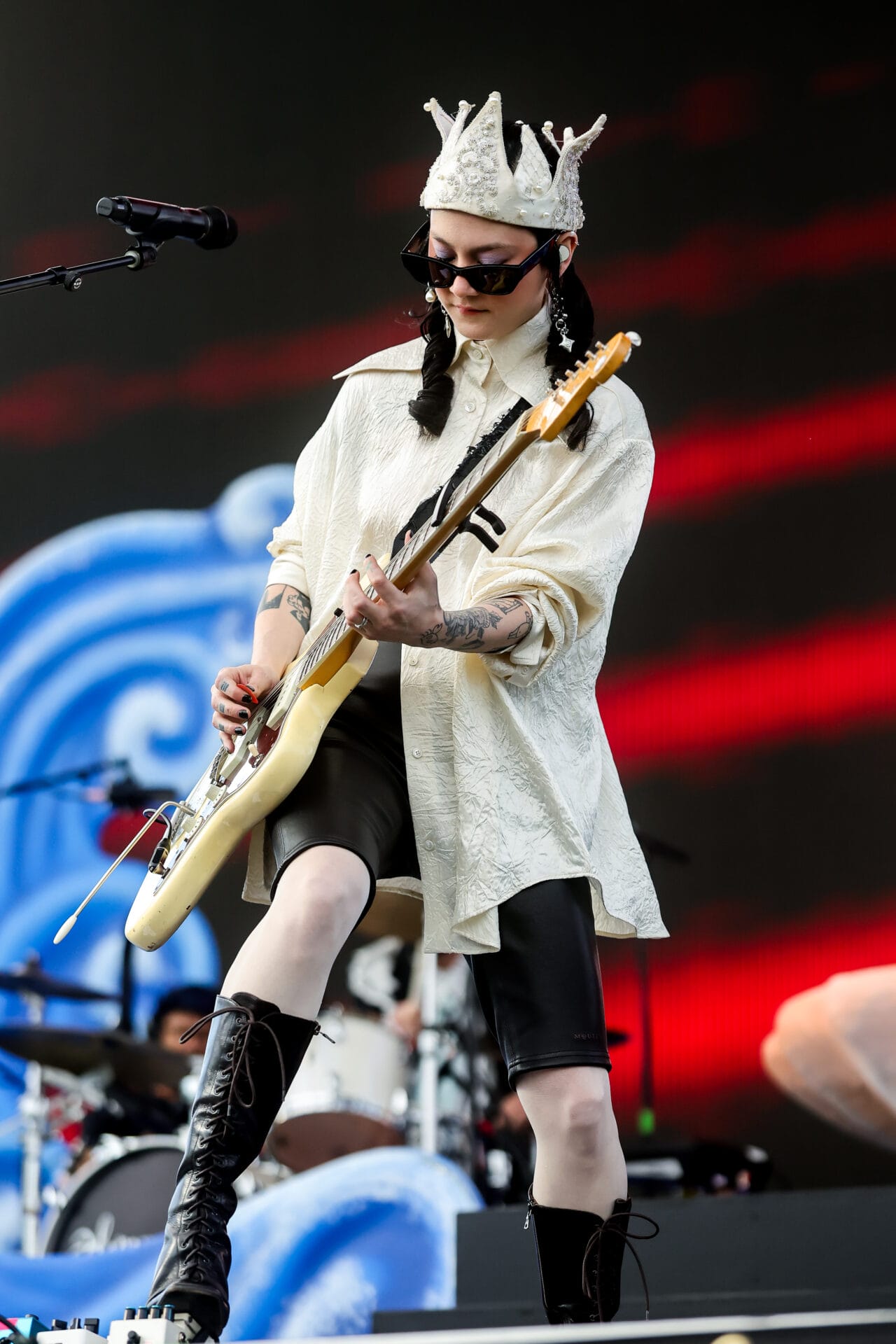 Michelle Zauner, vokalis utama band indie pop Japanese Breakfast, mencuri perhatian pada hujung minggu pertama Coachella dengan padanan kemeja butang bersaiz besar dan seluar pendek kulit daripada McQueen. Menambahkan sentuhan dramatik pada penampilannya, pemuzik Korea-Amerika ini mengenakan mahkota mutiara rekaan khas oleh Renacio Reyes, cermin mata hitam Pearl Tear hasil rekaan pereka Korea Kimhekim, serta anting-anting berstruktur dari Monika Szamalek.