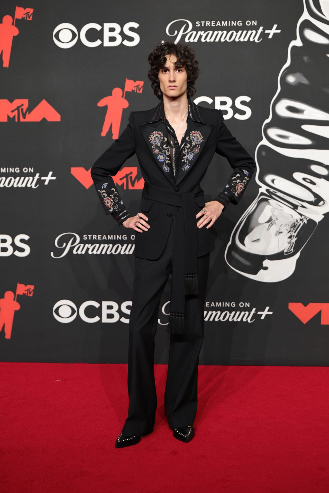 Lady Gaga memilih gaun hitam dramatik rekaan Marc Jacobs dari koleksi musim luruh 2025. Busana tersebut menampilkan sulaman renda floral, lengan kembang yang megah serta potongan mermaid yang anggun. Pemenang 14 kali Grammy itu turut melengkapkan penampilan dengan hiasan kepala bunga merah yang terselit indah pada sanggulnya, dipadankan dengan potongan poni pendek yang manis.