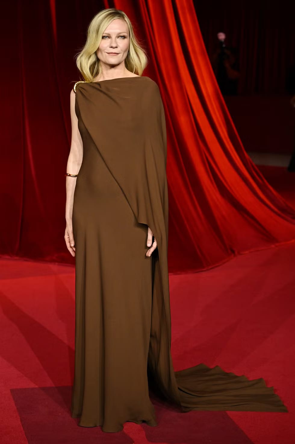 Kirsten Dunst memilih gaun Gucci elegan dengan cape panjang meleret dalam rona coklat klasik.