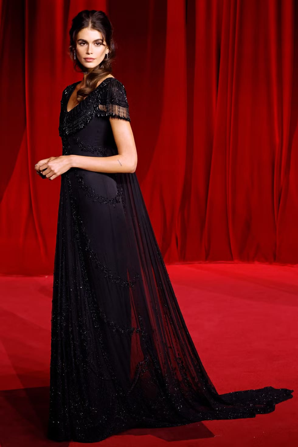 Kaia Gerber merujuk kepada arkib untuk penampilannya di karpet merah, tiba dengan gaun couture vintage Givenchy dari tahun 1997, yang menampilkan hiasan manik halus dan lapisan fabrik meleret.
