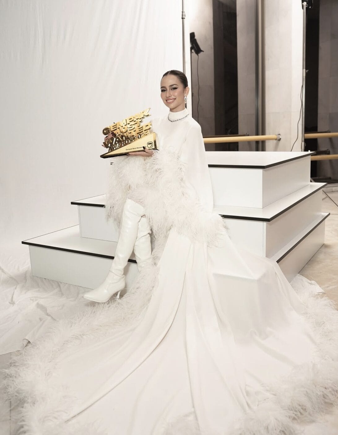 Gandingan but putih tinggi dengan aksesori melengkapkan penampilannya dengan estetika klasik yang mewah.