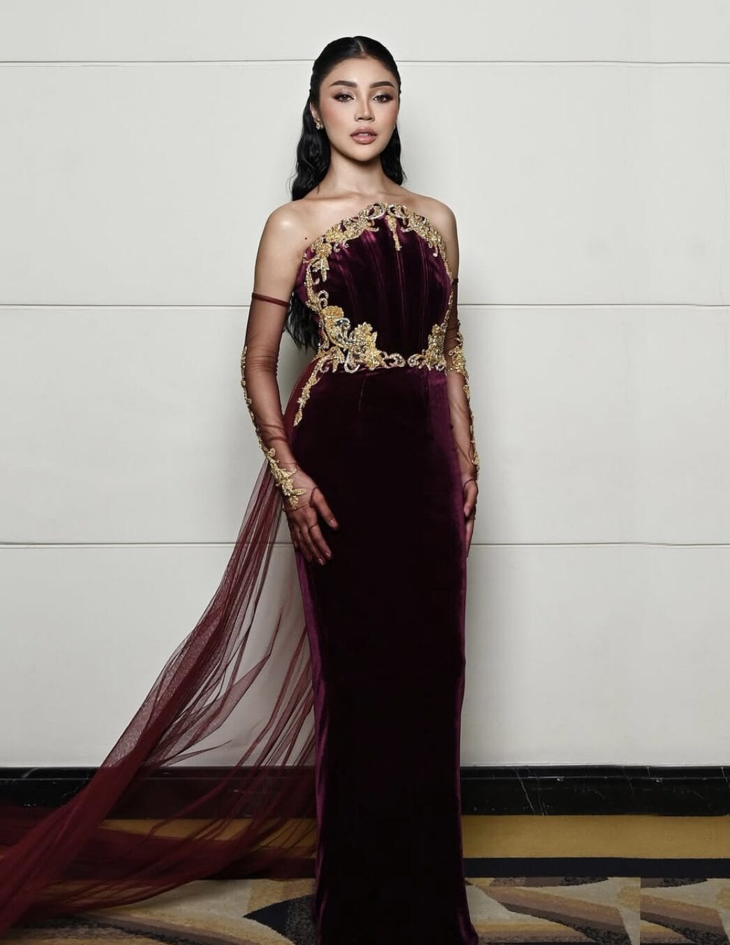 Scha Elinnea tampil memukau di Gempak Most Wanted Awards dengan gaya yang penuh keanggunan dan kemewahan. Beliau mengenakan gaun baldu berwarna maroon gelap rekaan Shanell Harun yang memberikan aura dramatik dan mewah.