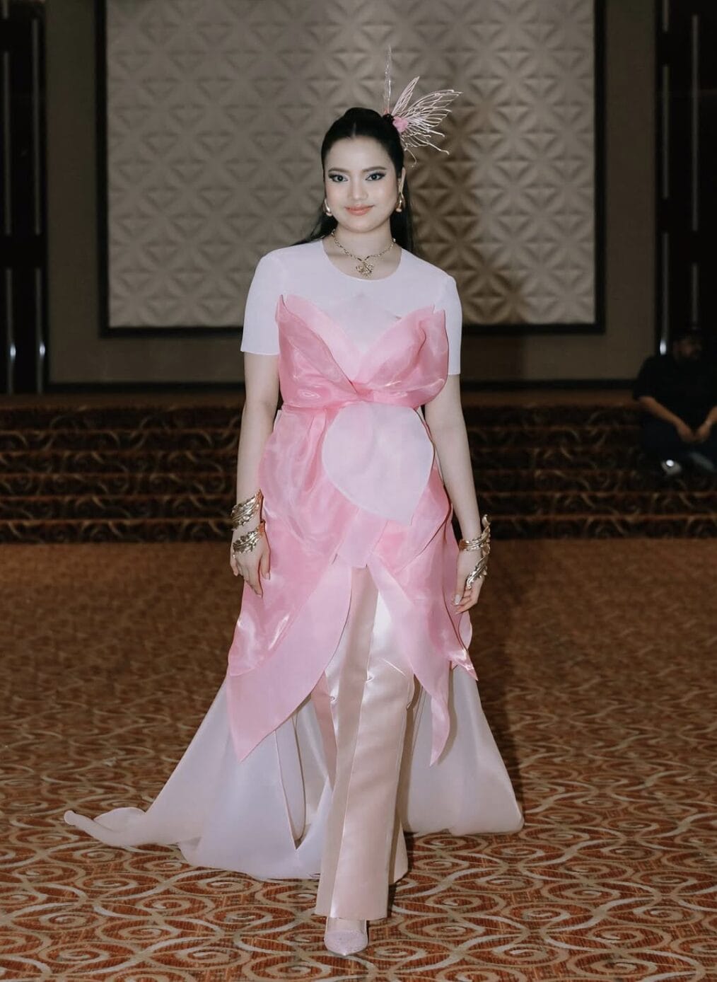 Leona tampil dengan gaya yang unik dan elegan di Gempak Most Wanted Awards 2025! Gaun rekaan Khuntumn ini memiliki elemen rama-rama, memberikan kesan feminin dan dreamy. Dipadankan bersama aksesori emas dan headpiece rama-rama yang artistik. Menariknya, headpiecenya bergerak!