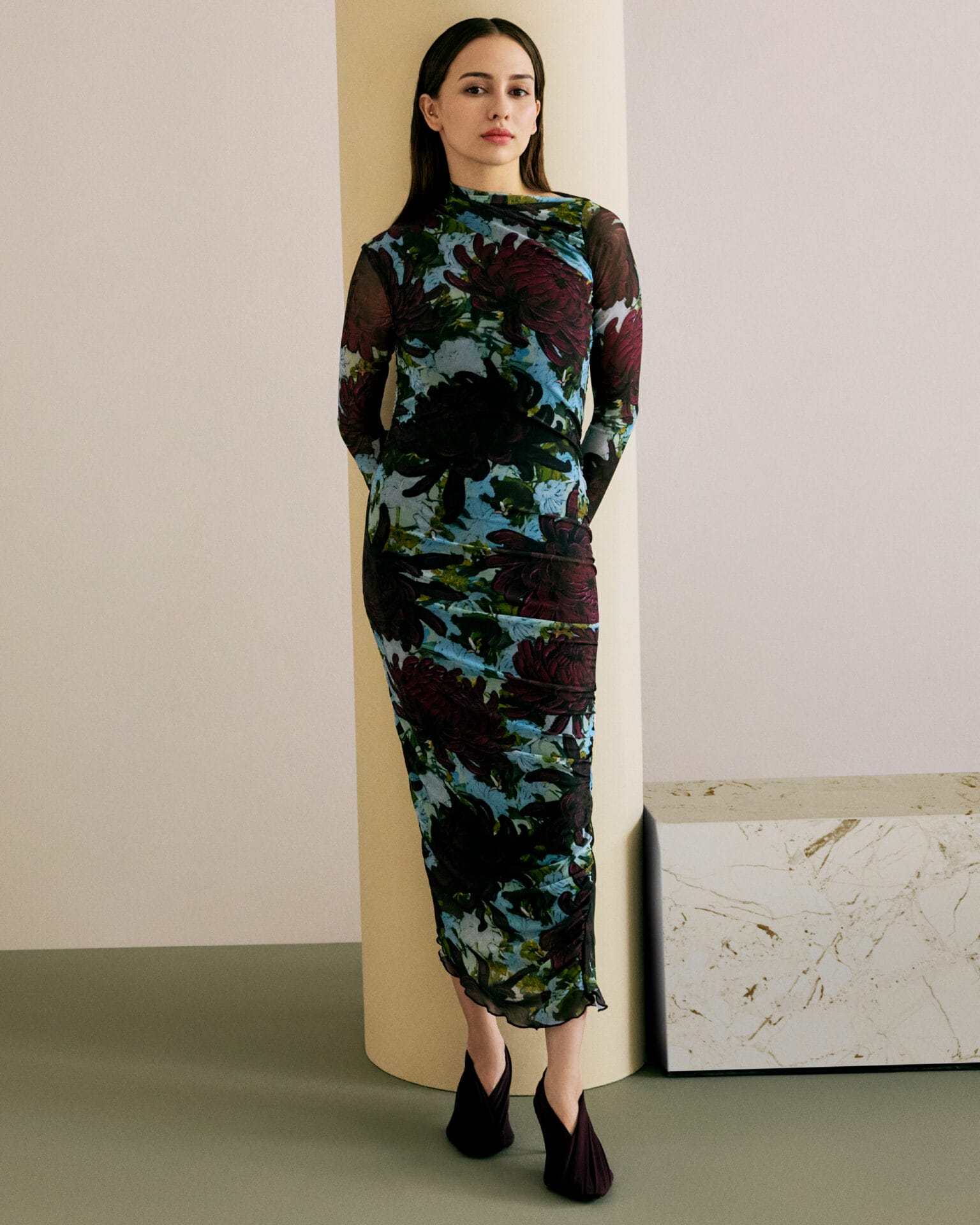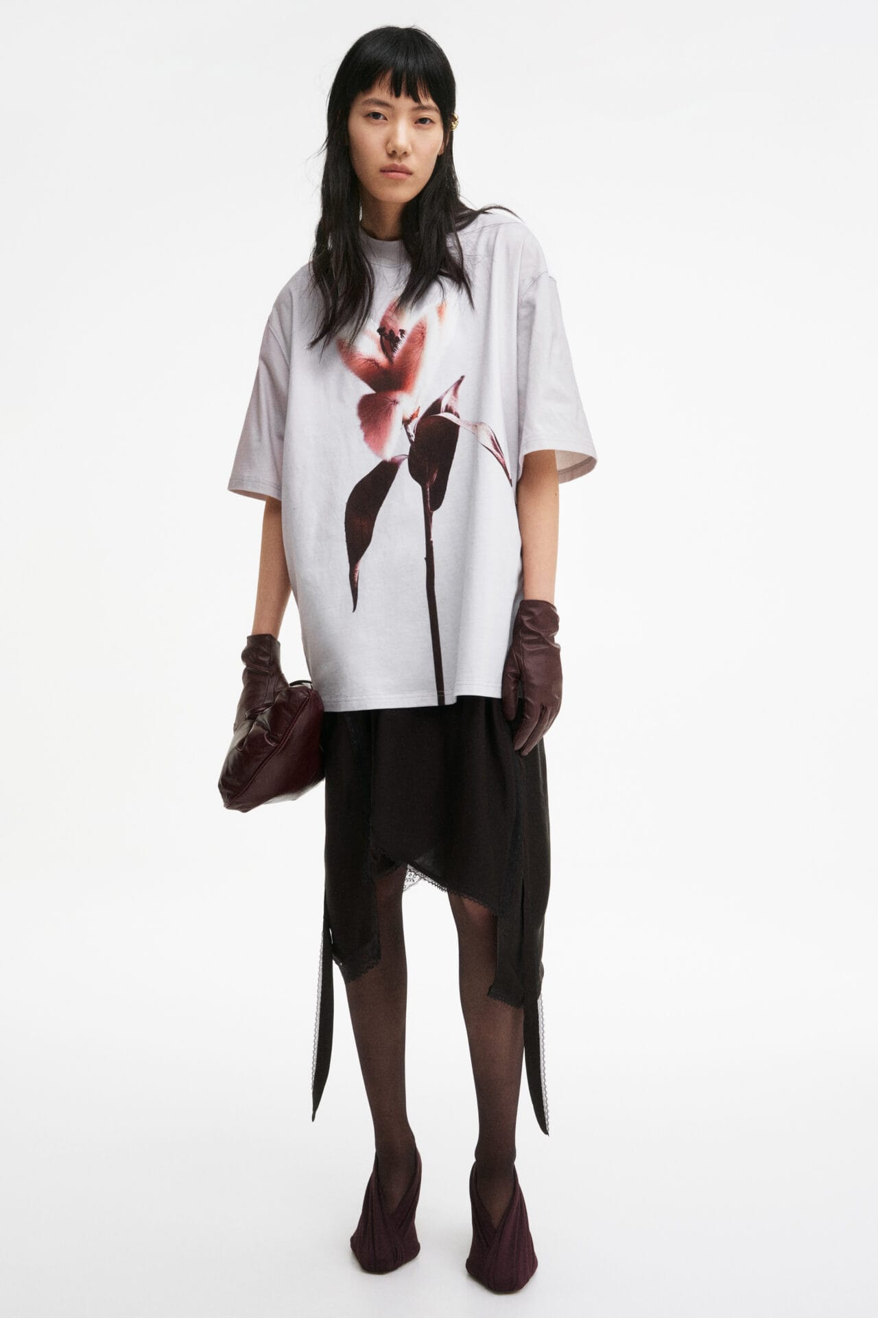 Aksesori pula hadir dengan proporsi yang playful. Antara item menarik termasuk beg kulit berbentuk bantal rona burgundy, kasut tumit tinggi yang disarung fabrik drape, serta sneakers hitam gabungan kulit, mesh dan suede. Perhiasan seperti anting-anting, rantai dan brooch pula menampilkan motif bunga dengan kemasan vintage yang unik.