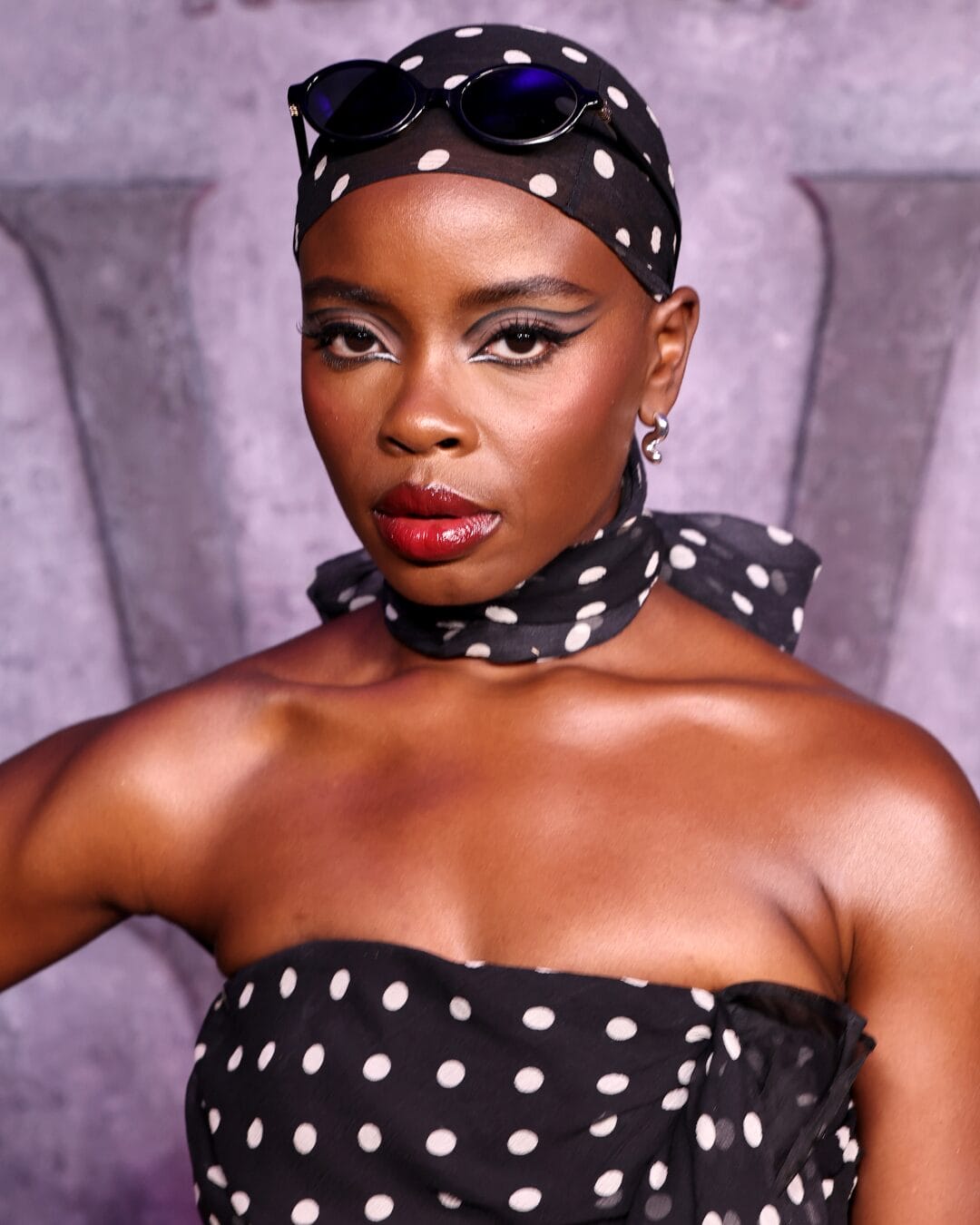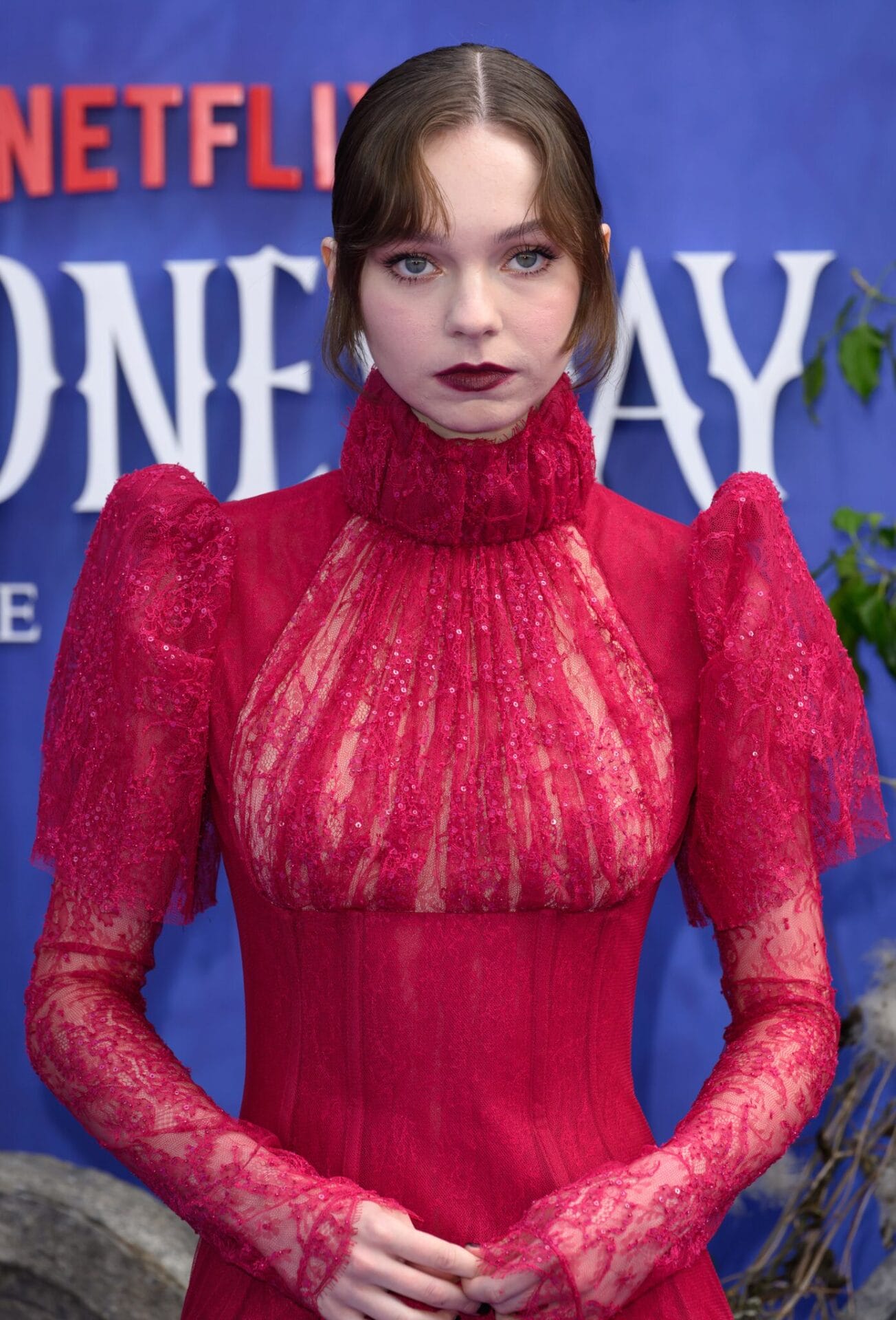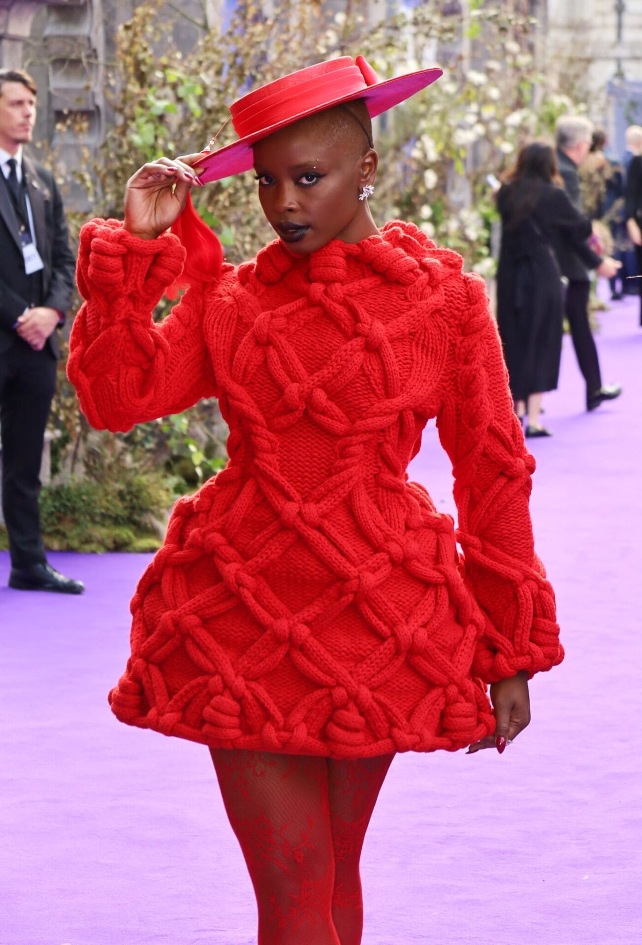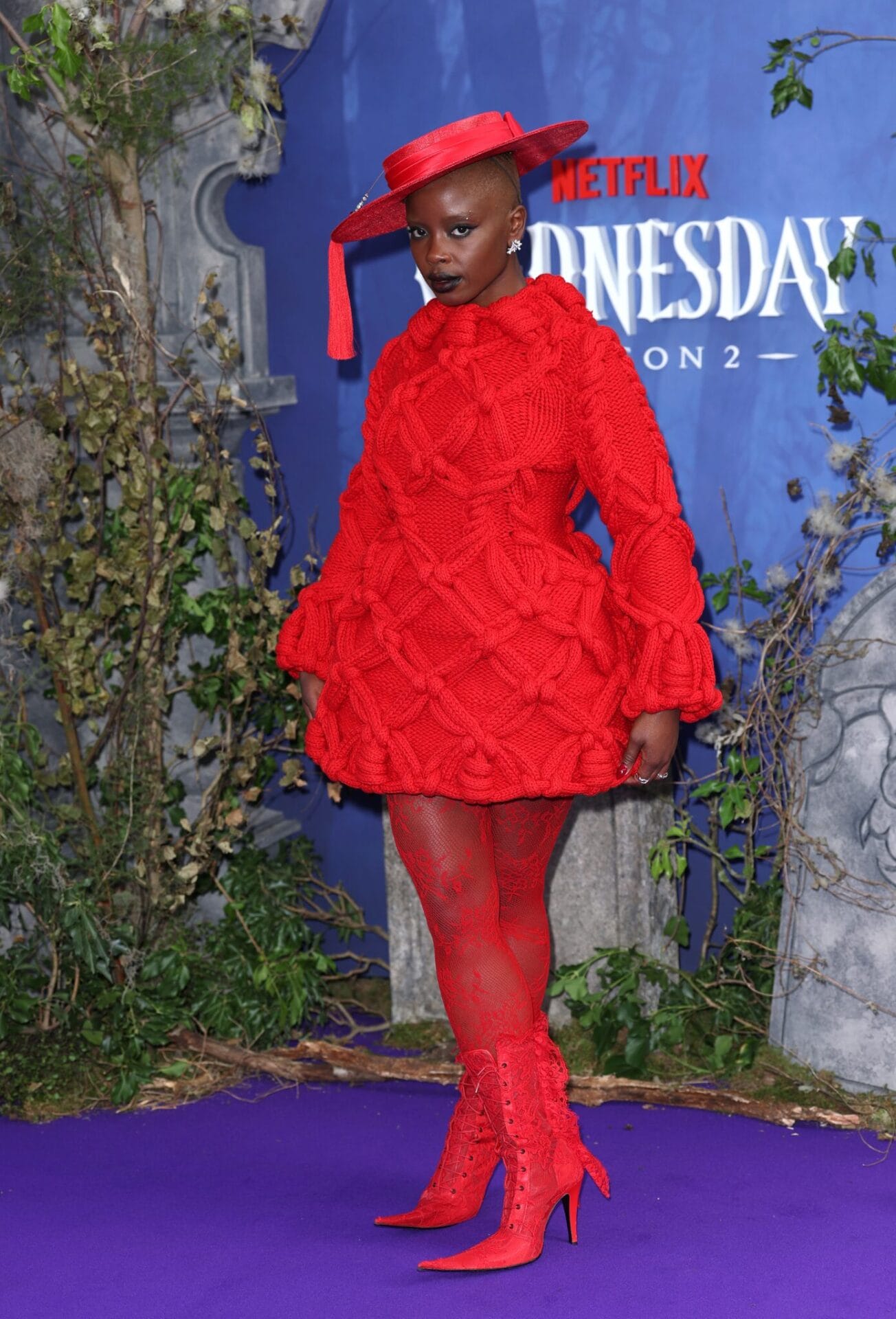 Joy Sunday mencuri perhatian di tayangan perdana Wednesday Netflix dengan gaun rajutan kabel merah ceri rekaan McQueen, digayakan oleh Darryl Glover, pilihan berani yang meraikan dunia fantasi siri itu.