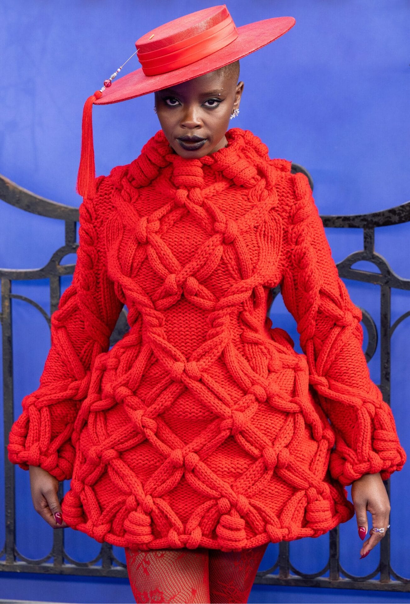 Simpulan rajutan rapi dan lengan panjang memberi sentuhan elegan, sementara stoking renda bunga, but bertali tinggi, dan topi merah berhias rumbai melengkapkan penampilan dari koleksi Musim Luruh/Sejuk 2025 yang penuh karakter.