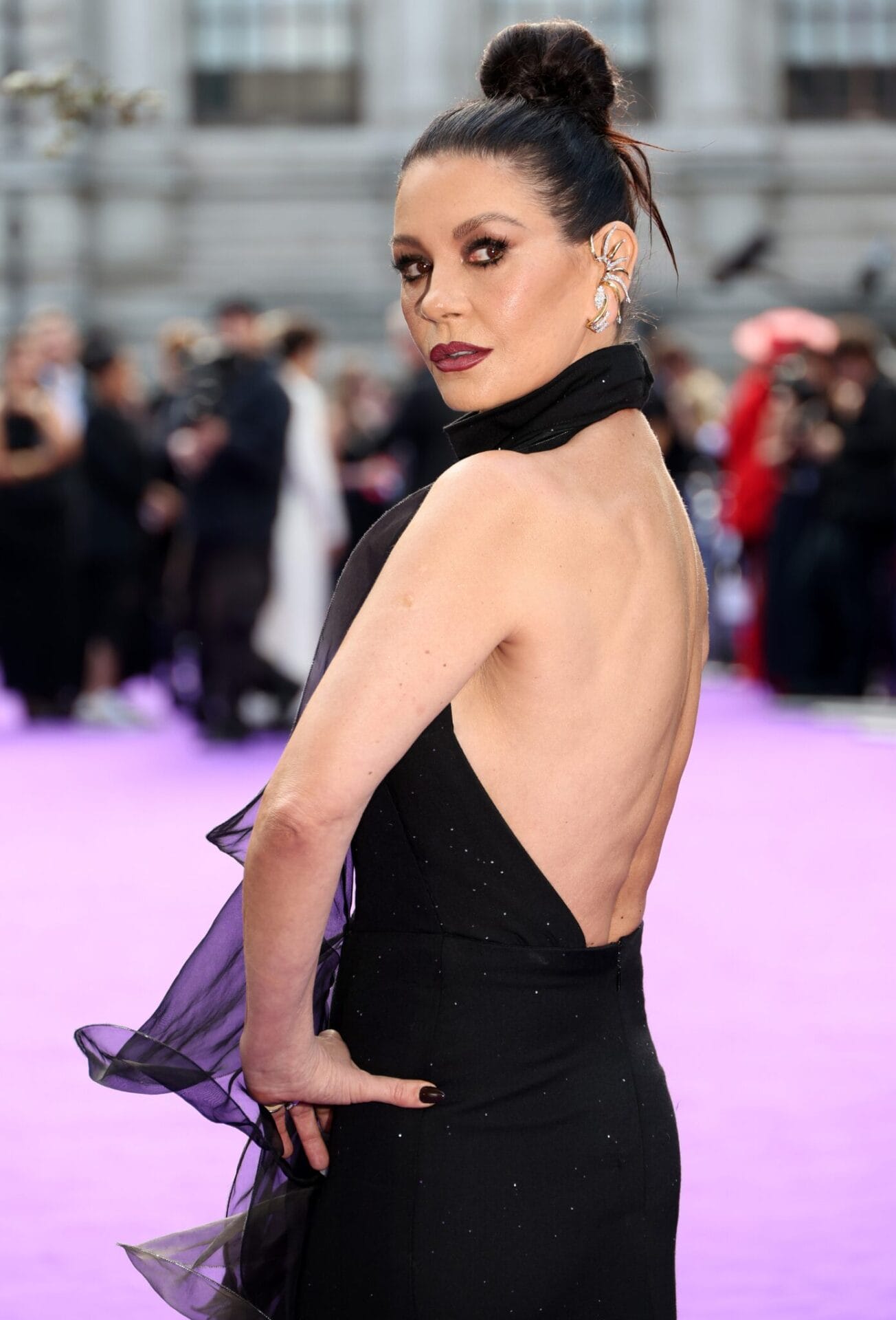 Zeta-Jones, yang membawakan watak ibu kepada Jenna Ortega di layar, mempesona dengan gaya klasik Morticia Addams. Beliau menyarung gaun hitam dramatik Stéphane Rolland Haute Couture dengan potongan halter keyhole, ruffle yang mengalir anggun, serta belahan tinggi di paha, kombinasi sempurna antara keanggunan dan aura gothic yang ikonik.