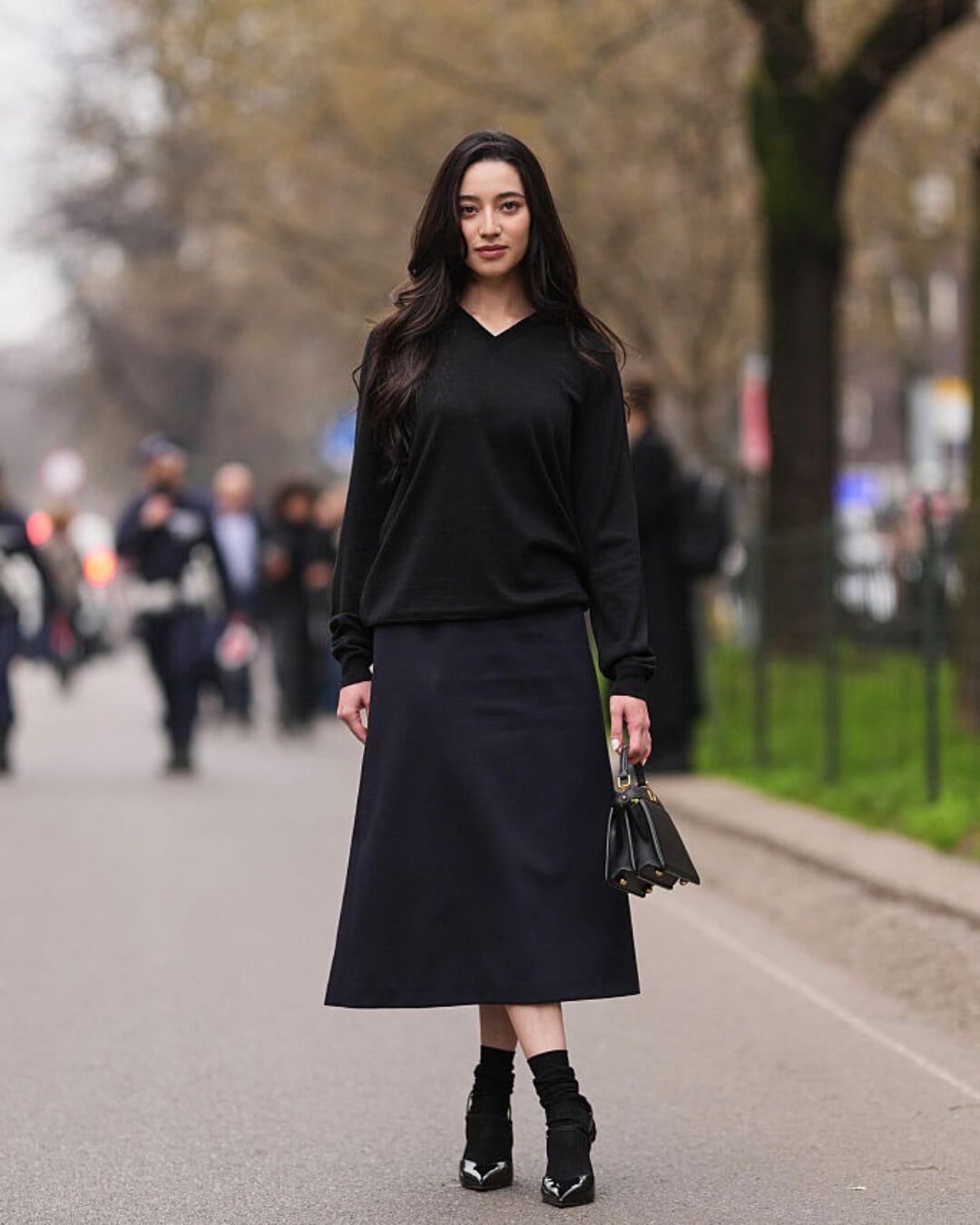 Ameera tampil dengan black knit V-neck sweater dan dipadankan dengan midi skirt yang ringkas namun bergaya. Potongan V-neck memberikan ilusi leher yang panjang dan menambah sentuhan feminin.