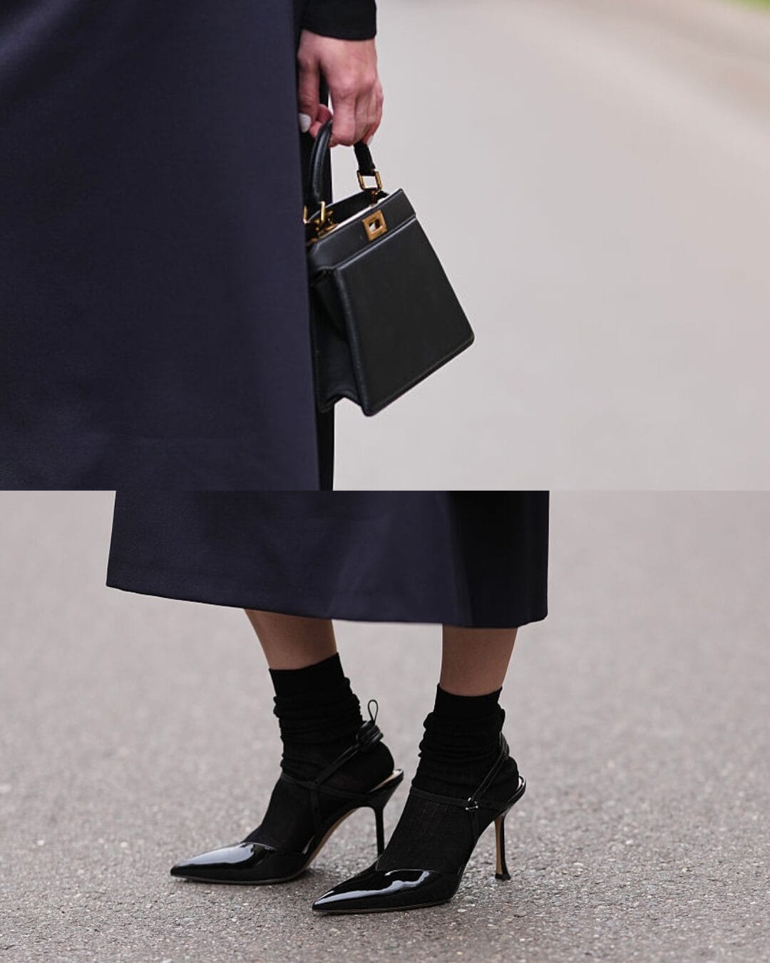 Strap bahu yang tebal menambah struktur pada rekaan, dan aksesori dipilih secara minimal, beg tangan hitam klasik dan sandal bertumit halus.