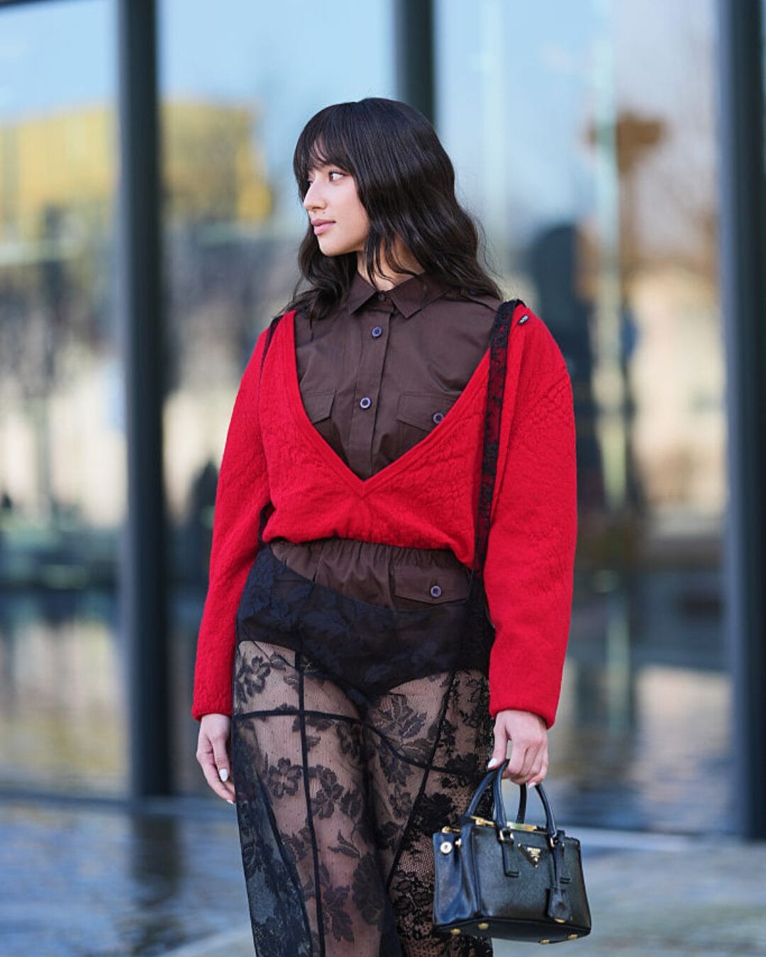 Dipadankan dengan black laced skirt, gabungan warna merah dan hitam mencipta kontras dramatik yang sofistikated. Renda pada skirt menambah tekstur dan detail halus.