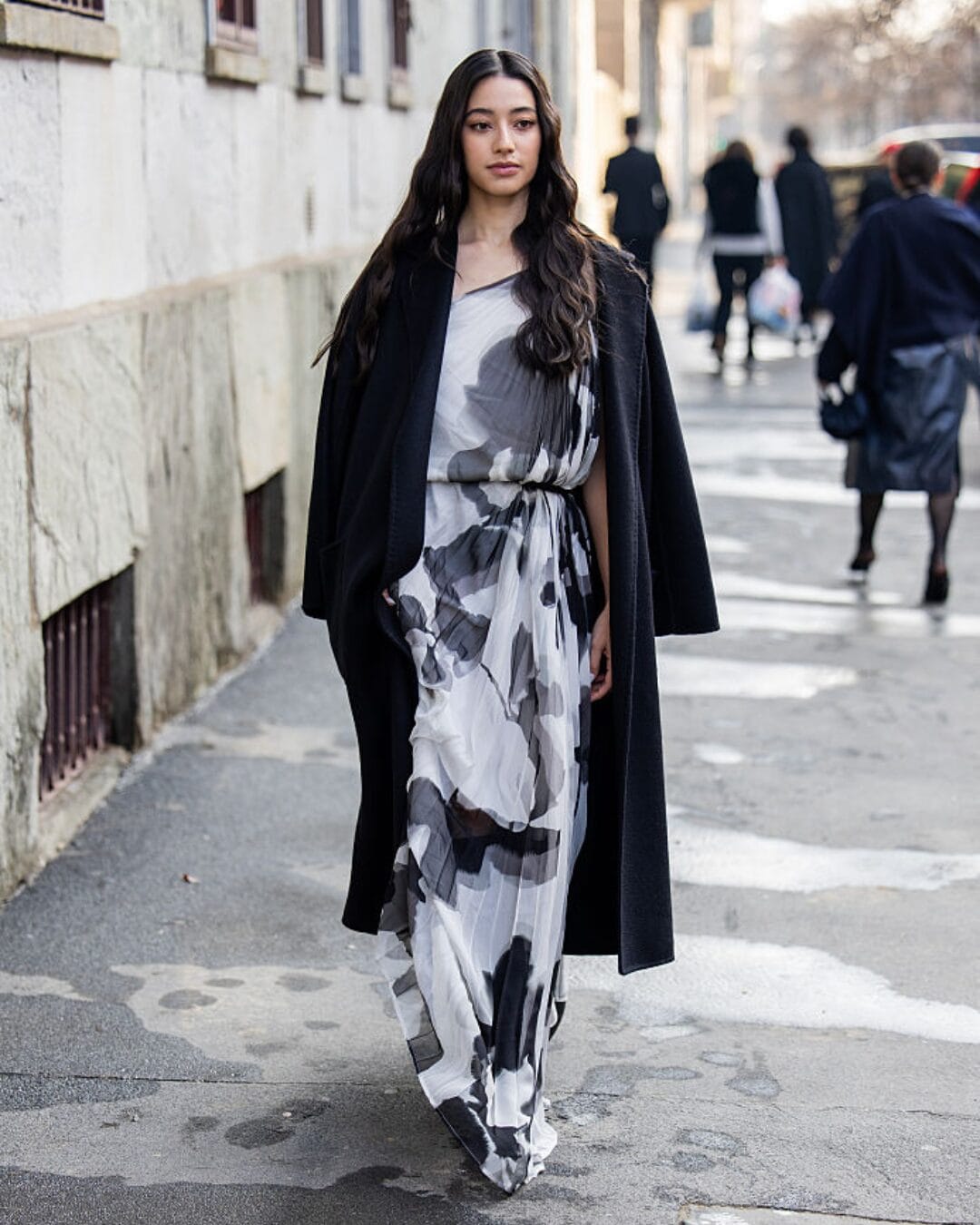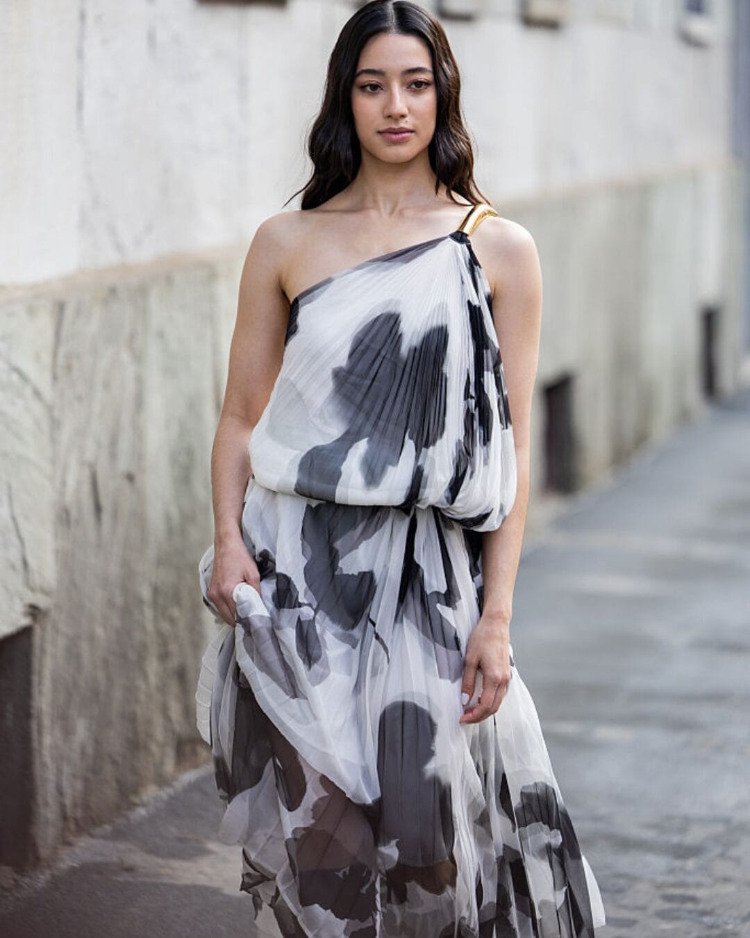 Gaun labuh bercorak abstrak hitam putih menjadi fokus utama, menampilkan siluet lembut dan jatuhan kain yang mengalir anggun. Corak floral berskala besar dalam tona monokrom memberi efek artistik dan dramatik tanpa perlu warna terang. Potongan satu bahu (one-shoulder) dengan perincian draping di pinggang menambah elemen feminin yang refined serta membentuk siluet badan dengan halus.