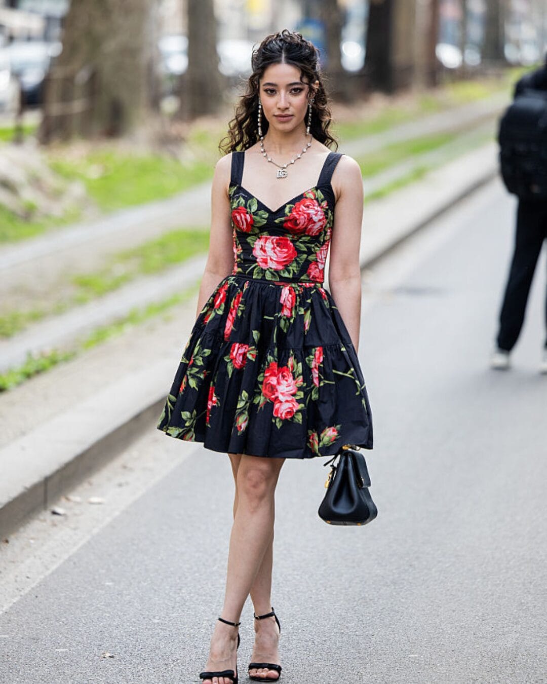 Gaun hitam tanpa lengan ini dihiasi corak bunga ros merah yang besar dan menyerlah, mencipta kontras berani antara latar gelap dan motif floral yang hidup. Potongan bahagian atas yang fitted dengan garis leher berbentuk hati (sweetheart neckline) menonjolkan siluet feminin, manakala skirt kembang paras lutut memberikan efek volume yang elegan dan playful.