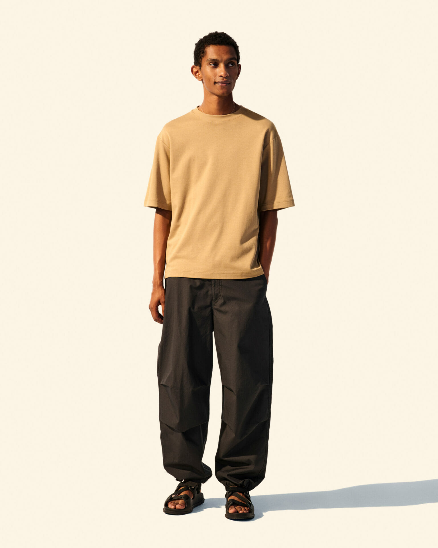 Turut hadir dengan reka bentuk crew neck kemeja-T dengan lengan tiga suku, menyempurnakan lagi padanan rupa ‘boxy fit’. Ciri utilitarian yang mudah dengan tali boleh laras di penghujungnya, merupakan antara ciri yang menarik terdapat pada Parachute Pants untuk koleksi kali ini.