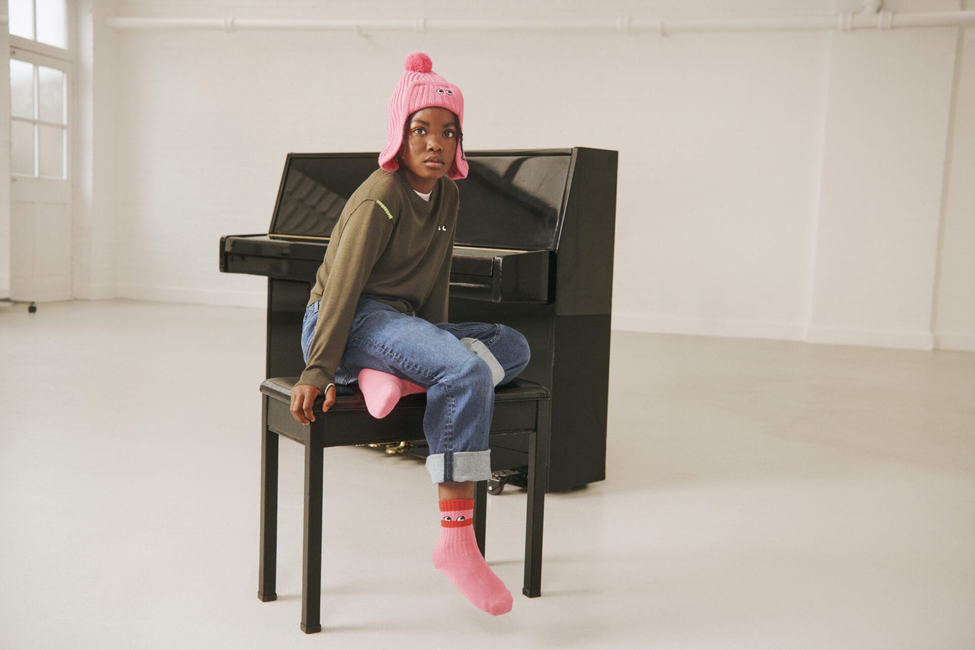 Sweater bulu Merino untuk kanak-kanak – pertama kali bagi Uniqlo, mempunyai rasa yang selesa dan mudah dibersihkan. Ciri unik dan ceria termasuk lubang ibu jari pada lengan kanan yang mempunyai jahitan bertemakan mulut, dan motif mata yang ditulam di dada.
