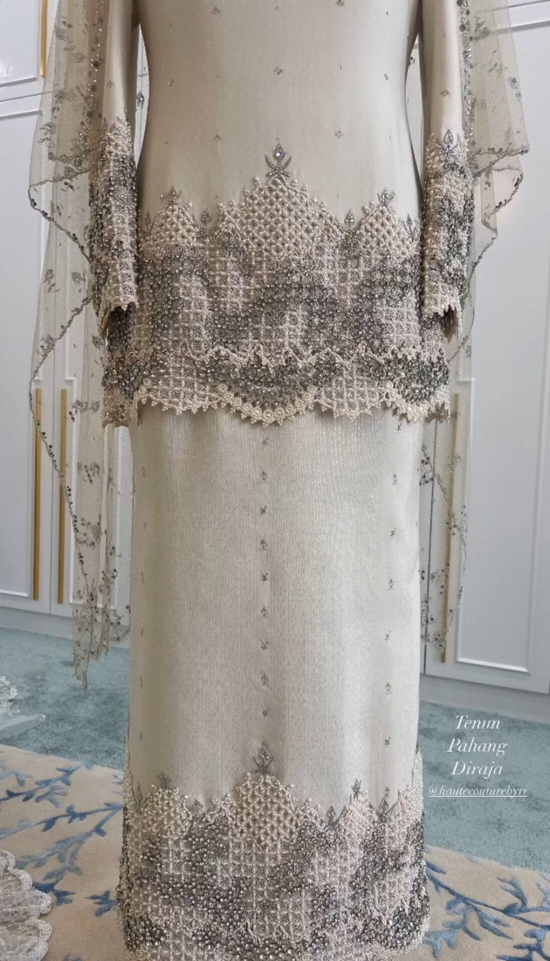 Tengku Puteri Afzan tampil memukau dalam persalinan berona putih suci yang direka khas oleh Haute Couture rekaan Rizalman. Rekaan yang elegan, disertai dengan pemilihan kain berkualiti tinggi, menjadikan sosok beliau menawan perhatian setiap mata yang memandang.
