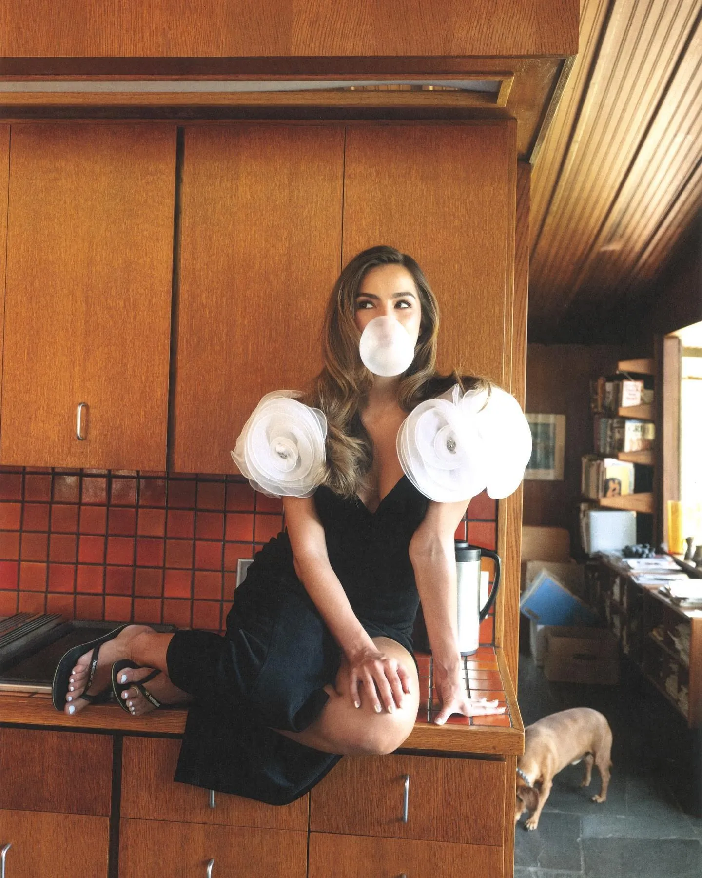 Summary vibes! Olivia Rodrigo memadankan selipar hitam dengan gaun pendek, topi bucket, dan cermin mata hitam yang memberi sentuhan santai namun tetap bergaya.