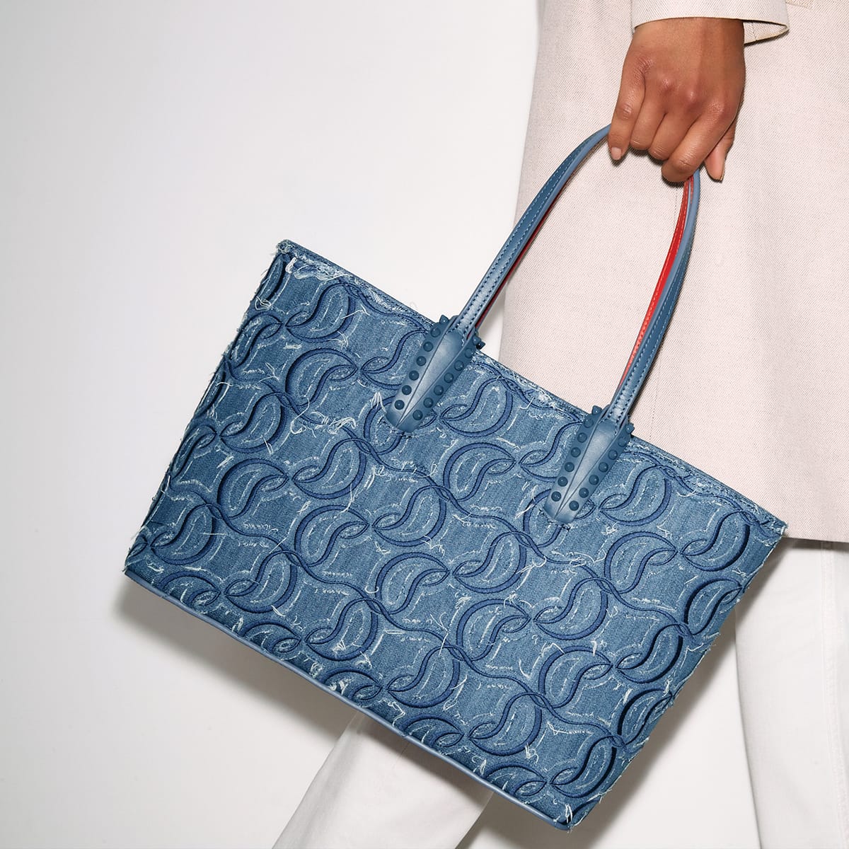Cabata Tote Klasik dihiasi dengan paku signature Maison Christian Louboutin, manakala kemasan denim grafik dan sulaman logo menambahkan sentuhan moden pada beg bandar klasik.