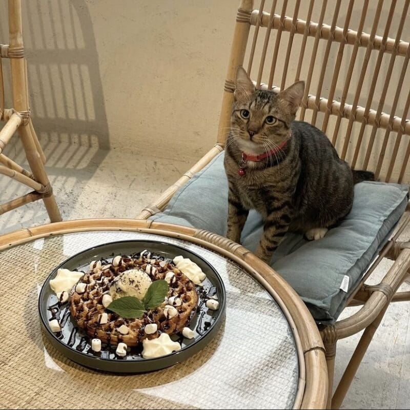 Ini adalah kafe yang mesra kucing; terdapat lapan ekor kucing pemastautin di belakang tempat itu, termasuk dua kucing Siam yang elegan.