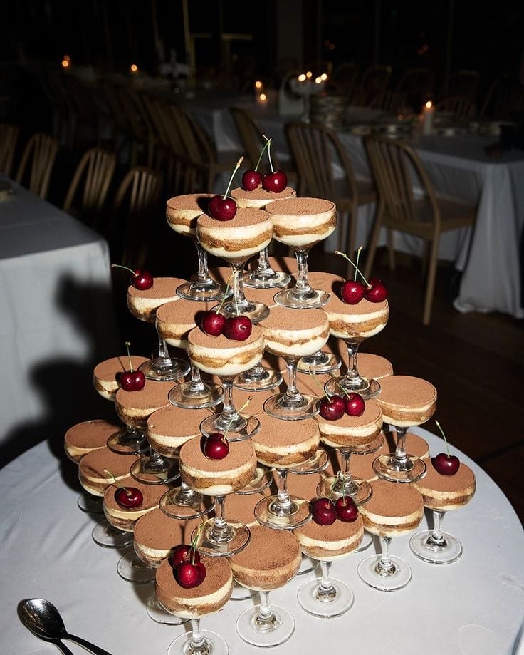 Jika beberapa tahun lalu trend kek perkahwinan lebih kepada siapa paling tinggi dan bertingkat, kini arahannya berubah ke sesuatu yang lebih minimalis. Ramai pasangan memilih kek setingkat bersaiz besar dengan rekaan ringkas, kemas dan aesthetic. Selain itu, susunan cup tiramisu juga mula menjadi pilihan lebih praktikal, mudah dihidang dan tetap cantik sebagai sebahagian daripada dekorasi