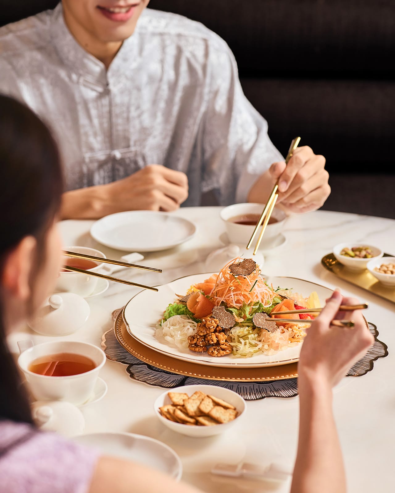 Antara hidangan utama yang menjadi tumpuan termasuk Yee Sang bersama Abalon dan Kaviar sebagai lambang kekayaan dan kejayaan, Ikan Kerapu Laut Dalam Sabah Kukus yang melambangkan kelimpahan serta keharmonian, dan Itik Panggang Trufel yang menambahkan sentuhan mewah pada hidangan perayaan. Sajian ini dilengkapkan dengan pilihan dim sum buatan tangan seperti Truffle Crystal Dumpling dan Gold-Foil Shrimp Dumpling with Oyster & Black Moss, disediakan dengan penuh ketelitian untuk menaikkan lagi pengalaman menjamu selera.