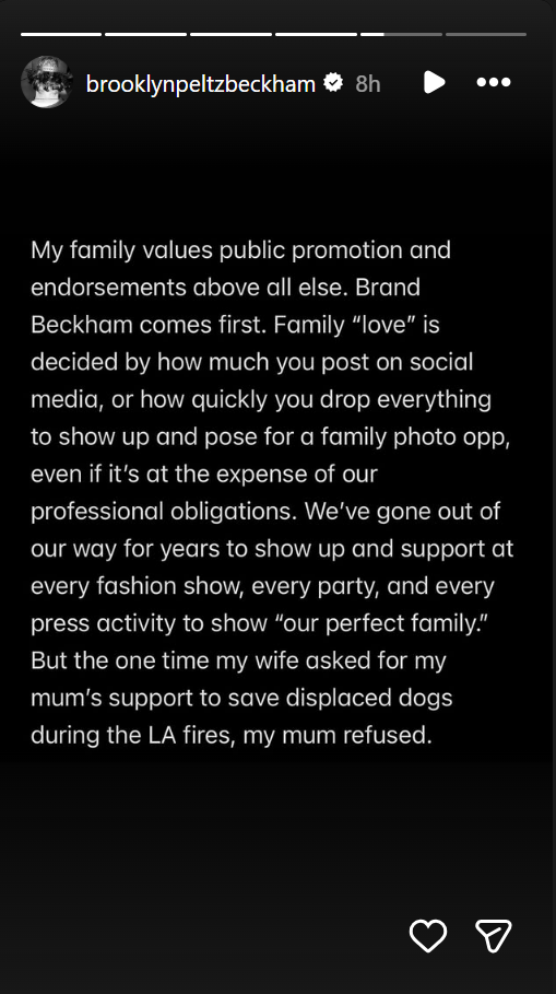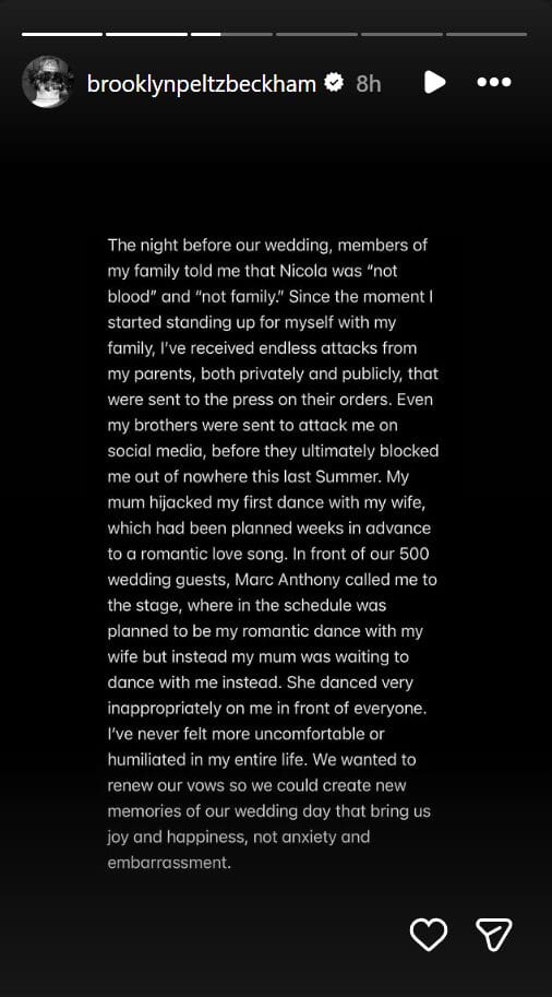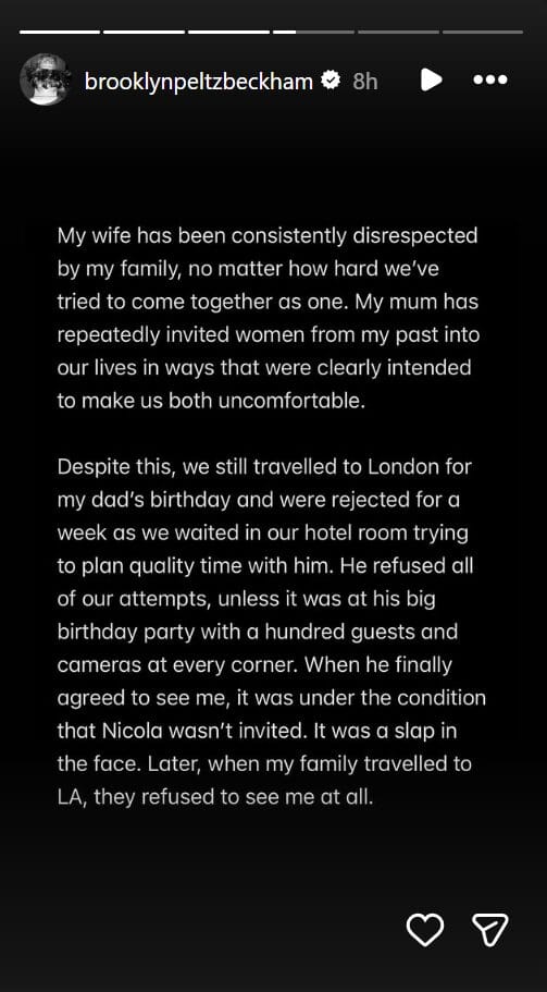Brooklyn Beckham mengejutkan ramai apabila memuat naik satu perkongsian berbentuk ‘surat terbuka’ di Instagram Story yang secara tidak langsung mendedahkan sisi gelap konflik dalaman keluarga Beckham.
