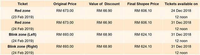 Melihat pada situasi ini dan semangat peminat mereka, anda boleh dapatkan tiket ke konsert BLACKPINK dengan diskaun sebanyak 10 peratus yang mana boleh didapatkan di stor rasmi YG Entertainment menerusi Shopee. Setiap peminat hanya terhad kepada dua tiket untuk satu transaksi.