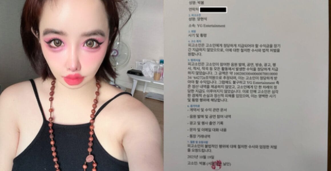 Pada Rabu lalu, Park Bom memuat naik hantaran bertajuk “From Park Bom”, beserta foto yang kelihatan seperti dokumen aduan saman bertulis tangan. Dalam dokumen itu, beliau mendakwa Yang Hyun-suk telah melakukan penipuan (fraud) dan penggelapan (embezzlement).