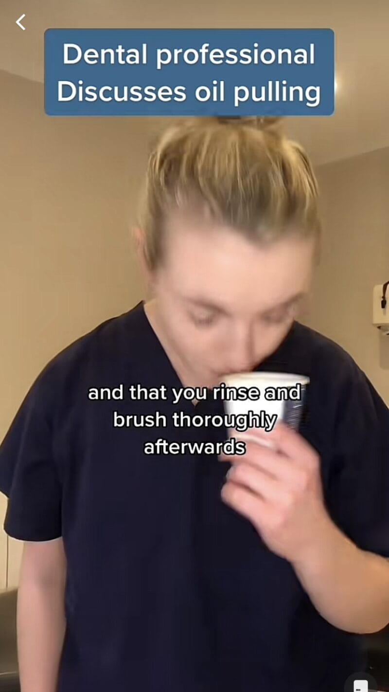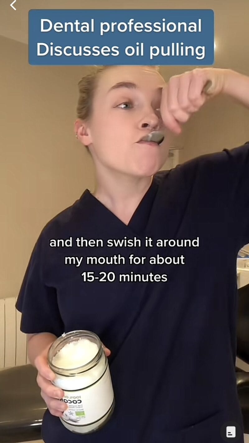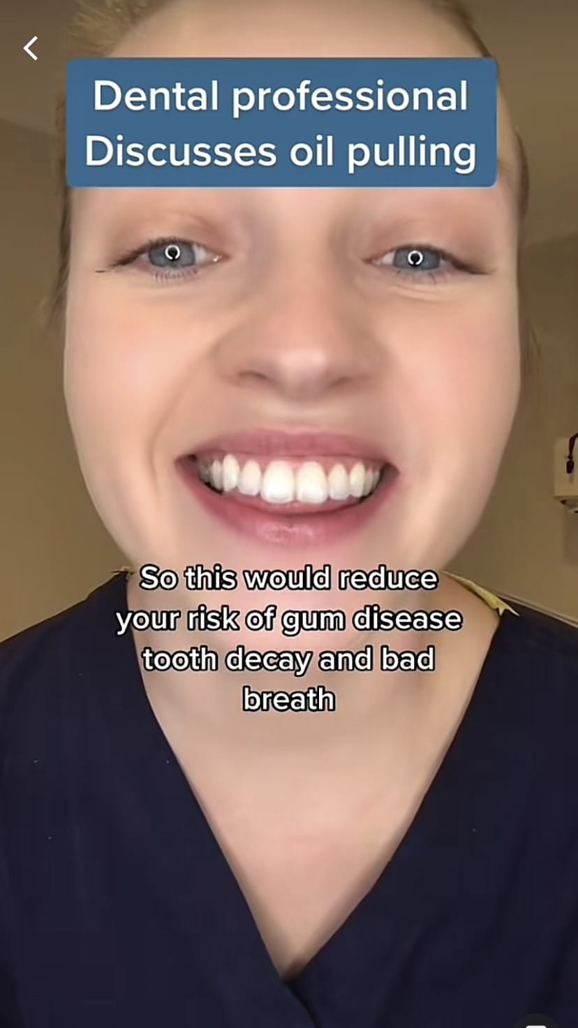 Seperti yang diketahui ramai, minyak kelapa mempunyai pelbagai khasiat, termasuk perawatan rambut, dan bahkan penurunan risiko penyakit jantung. Tetapi, salah satu kaedah yang semakin popular di Tiktok iaitu oil-pulling, yang menggunakan minyak kelapa untuk memutihkan gigi, menyegarkan nafas, dan meningkatkan kesihatan mulut. Dengan hanya berkumur seperti biasa selama 15 hingga 20 minit dan kemudian diakhiri dengan menggosok gigi anda seperti biasa.