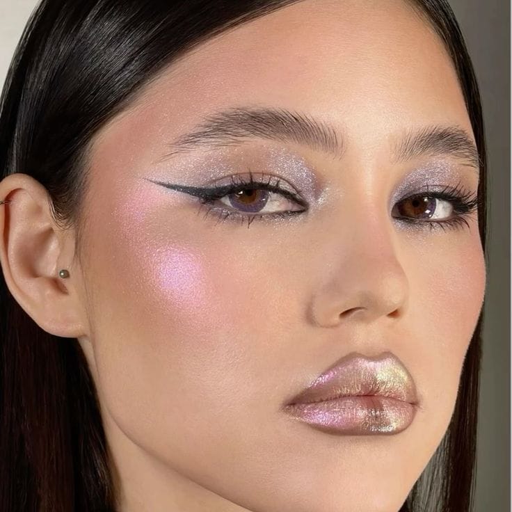 Solekan ini bermain dengan kilauan platinum yang lembut dan tidak berlebihan, terasa tenang dan mudah didekati persis lagu Seindah Biasa. Mata digayakan dengan eyeshadow rona silver atau lilac platinum yang disapu rata untuk memberi efek secara semula jadi, tanpa perlu dramatik. Eyeliner wing dilukis nipis dan kemas, sekadar membingkai mata dengan rapi. Bibir pula boleh dipadankan dengan gincu nude glossy yang segar, sementara kulit dibiarkan kelihatan luminous dan seimbang. Sesuai untuk peminat yang mahu tampil cantik dengan cara yang effortless.