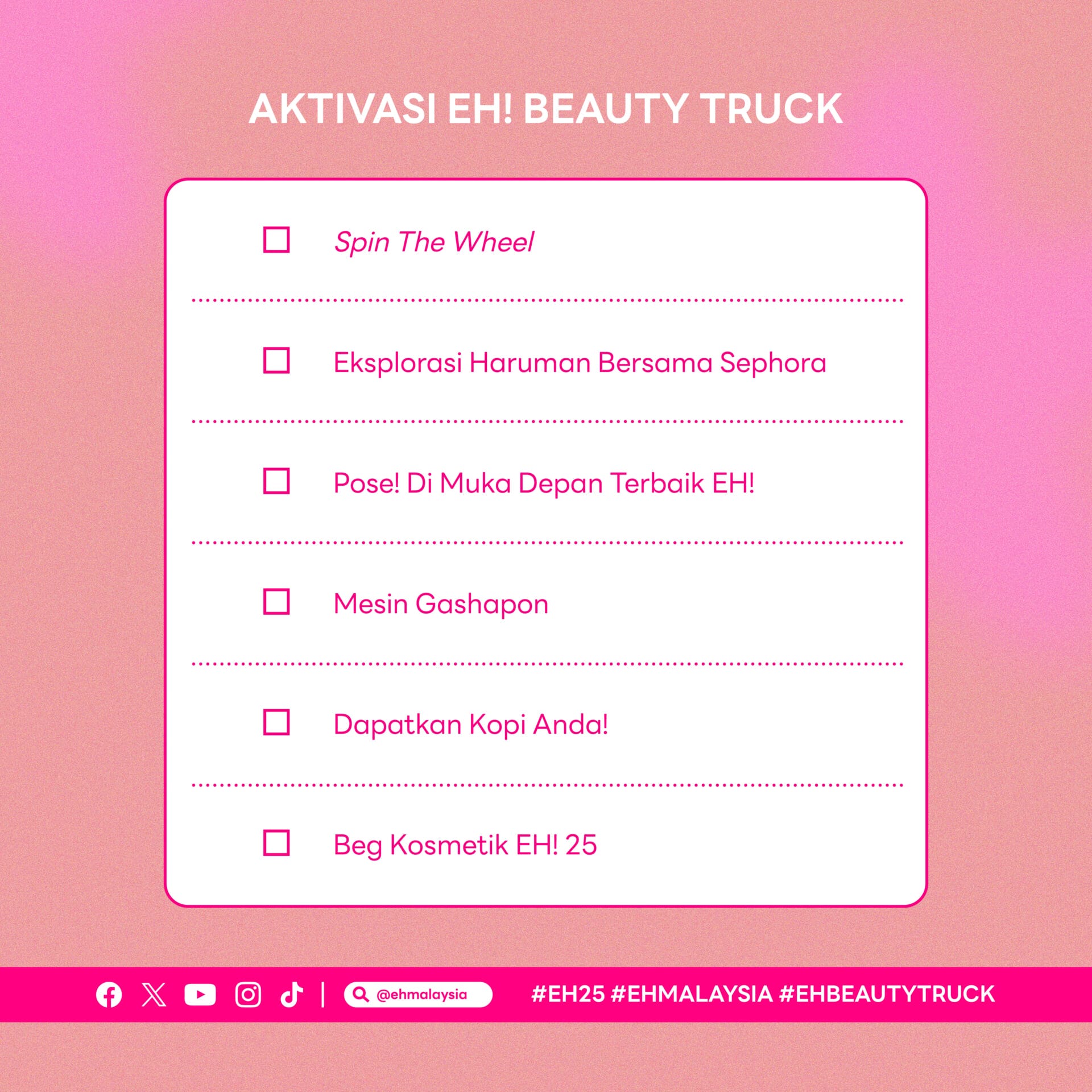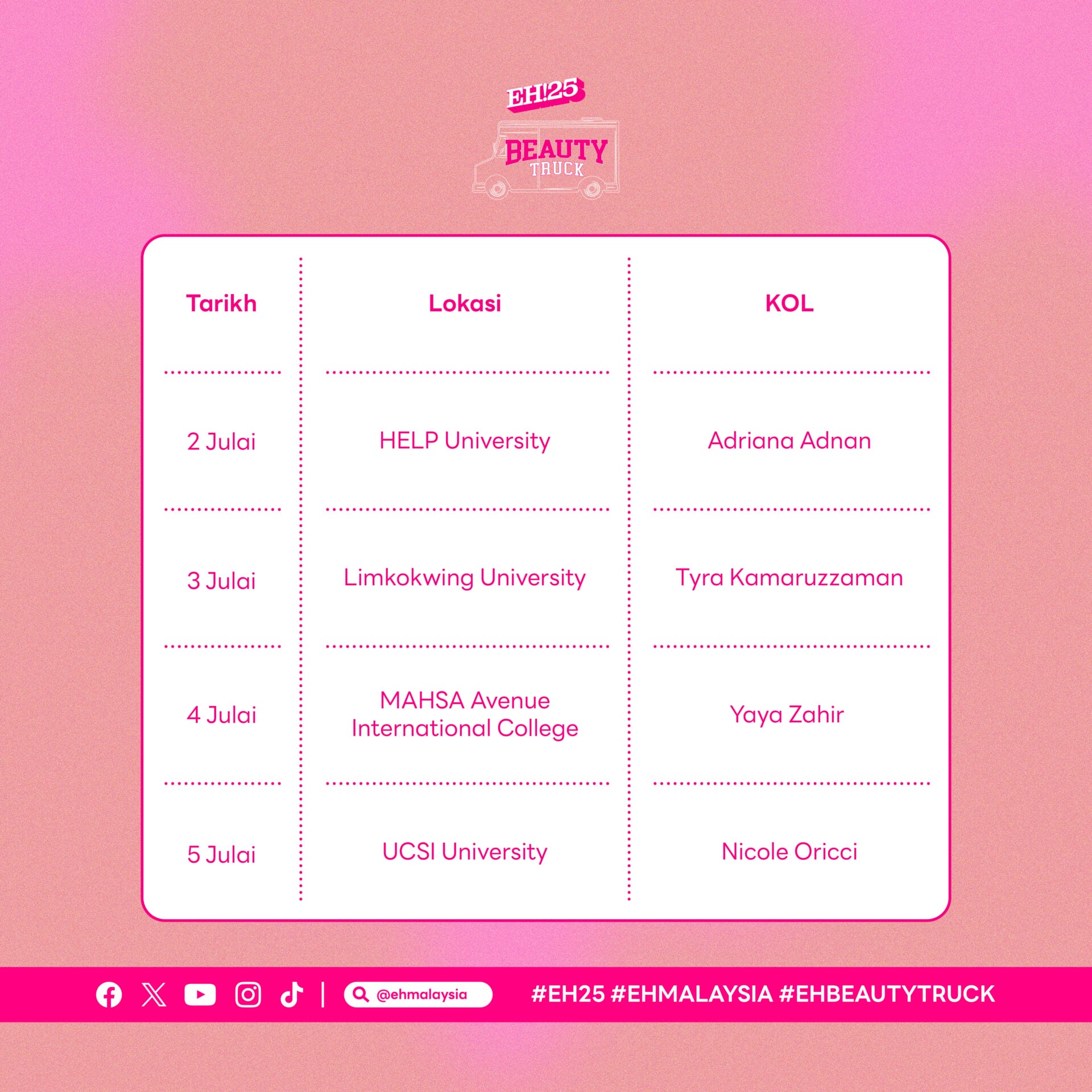 EH! pertama kali mengadakan Beauty Truck sempena ulang tahun kami yang ke-25. Berkolaborasi dengan Sephora, kami akan menjelajah beberapa Universiti terpilih. Usah lepaskan peluang ini!